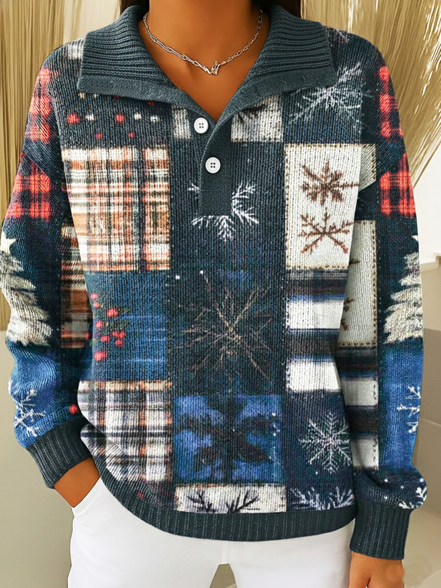Blue Snowflake Plaid Patchwork Print Lapel Sweater Top