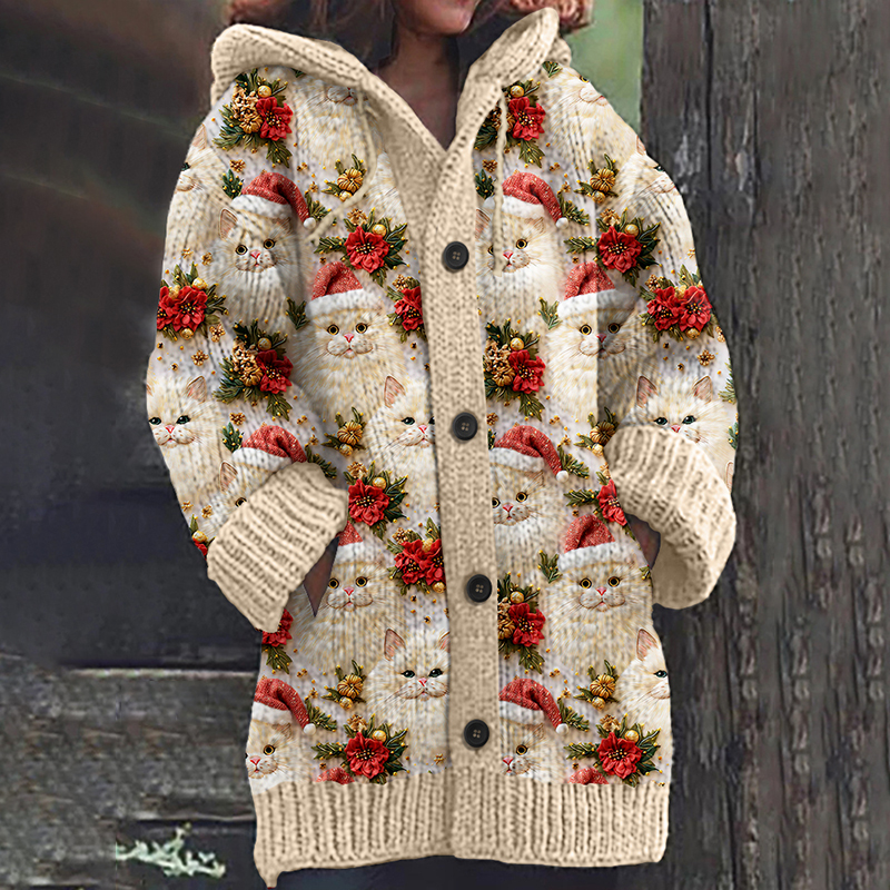 Christmas Cat Embroidery Knitted Warm Cardigan Sweater