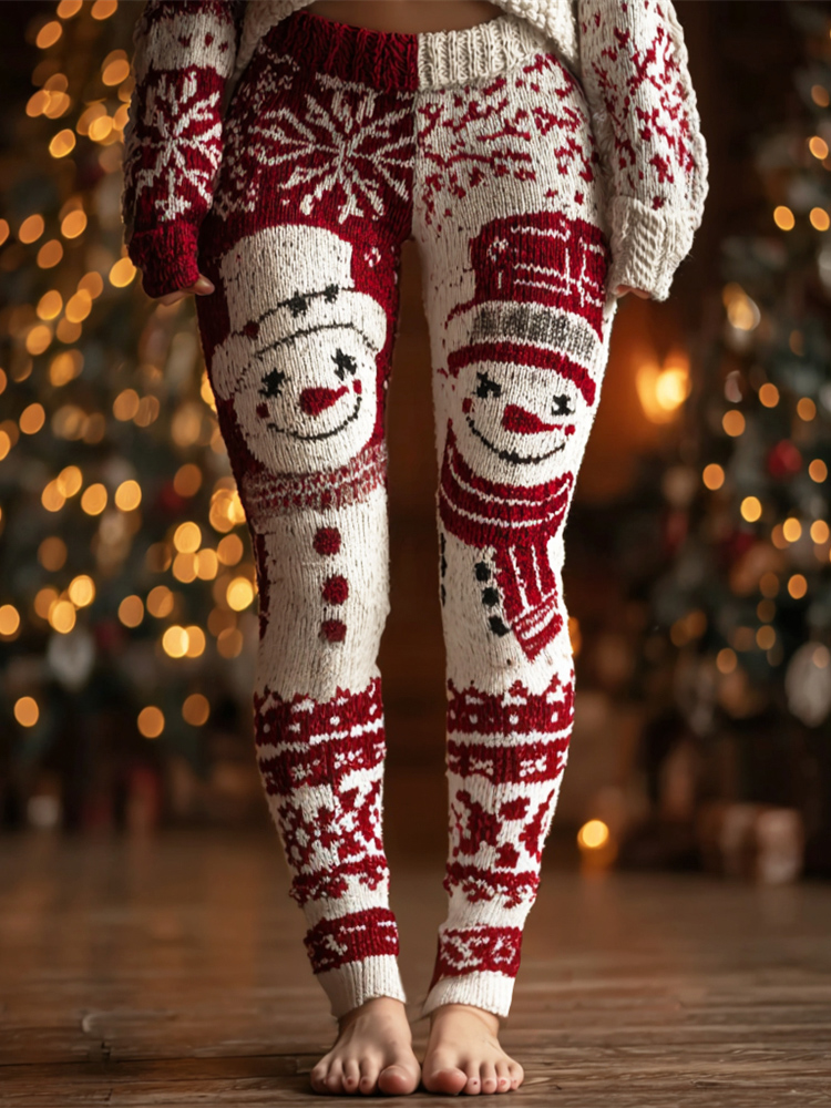 Christmas Cute Snowman Patchwork Pattern Women's Knit Leggings