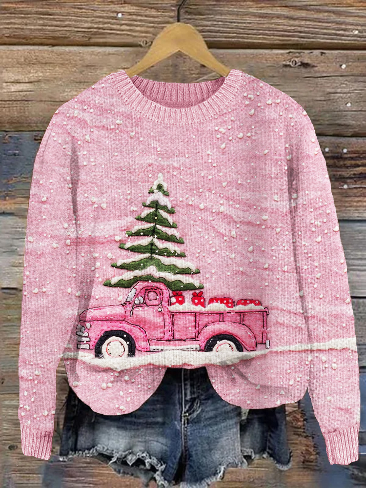 Christmas Pink Truck Snowy Felt Embroidered Cozy Sweater