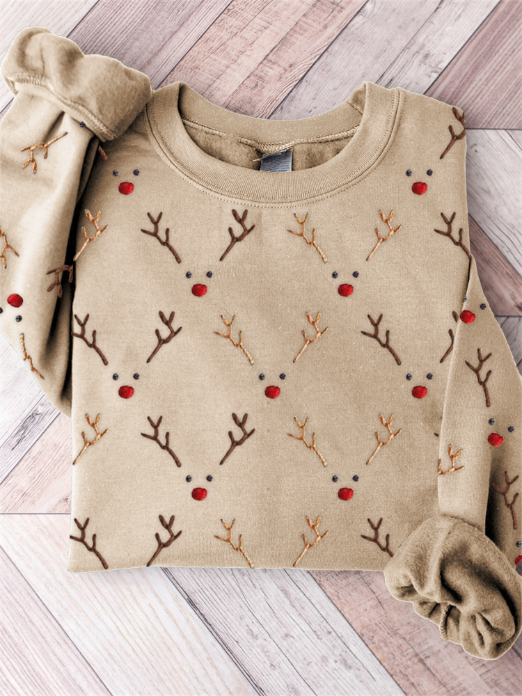 Christmas Reindeer Faces Embroidery Pattern Comfy Sweatshirt