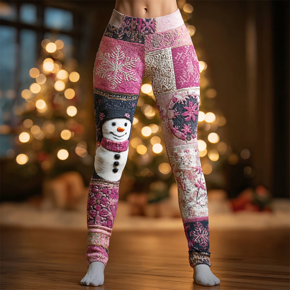 Christmas Snowman And Snowflake Patchwork Pattern Women's Knit Leggings
