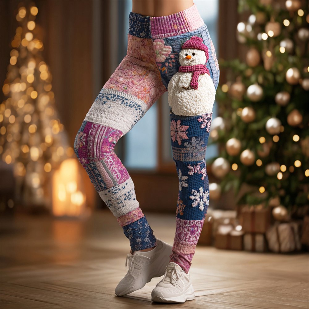 Christmas Snowman And Snowflake Patchwork Pattern Women's Knit Leggings