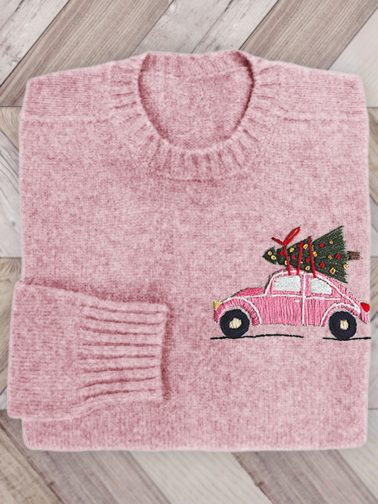Christmas Tree Pink Car Embroidered Cozy Knit Sweater