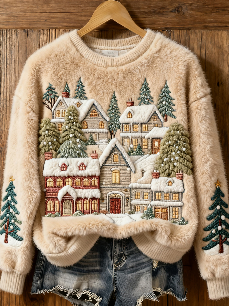 Christmas Tree Snow Scene Embroidery Women's Cozy Plush Sweater