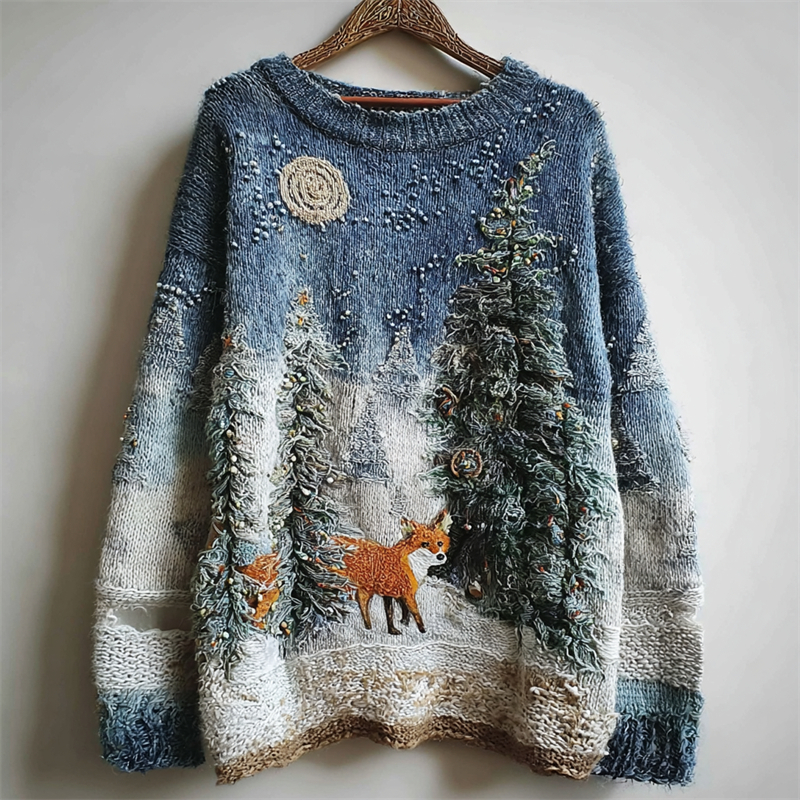 Fox Snowy Forest Night Cozy Fuzzy Knit Sweater