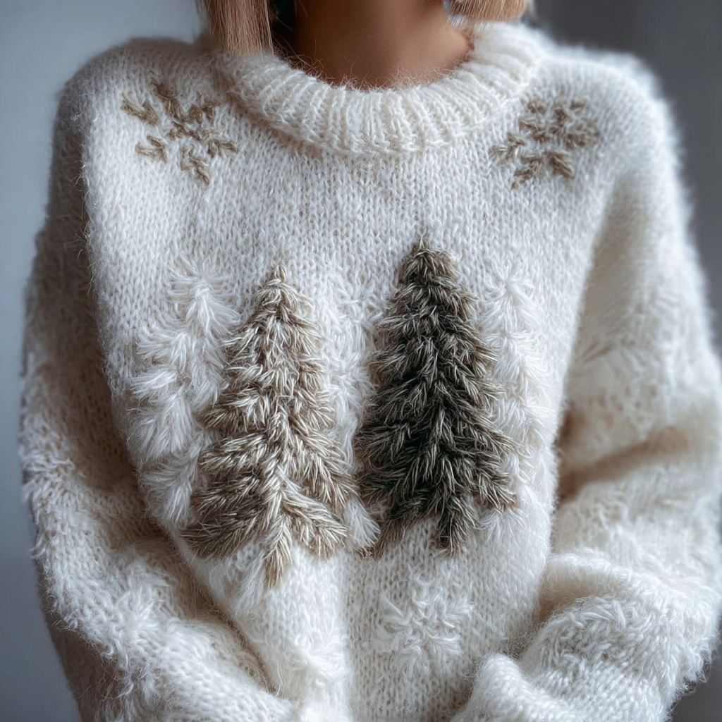 Fuzzy Christmas Tree Crew Neck Cozy Knit Sweater