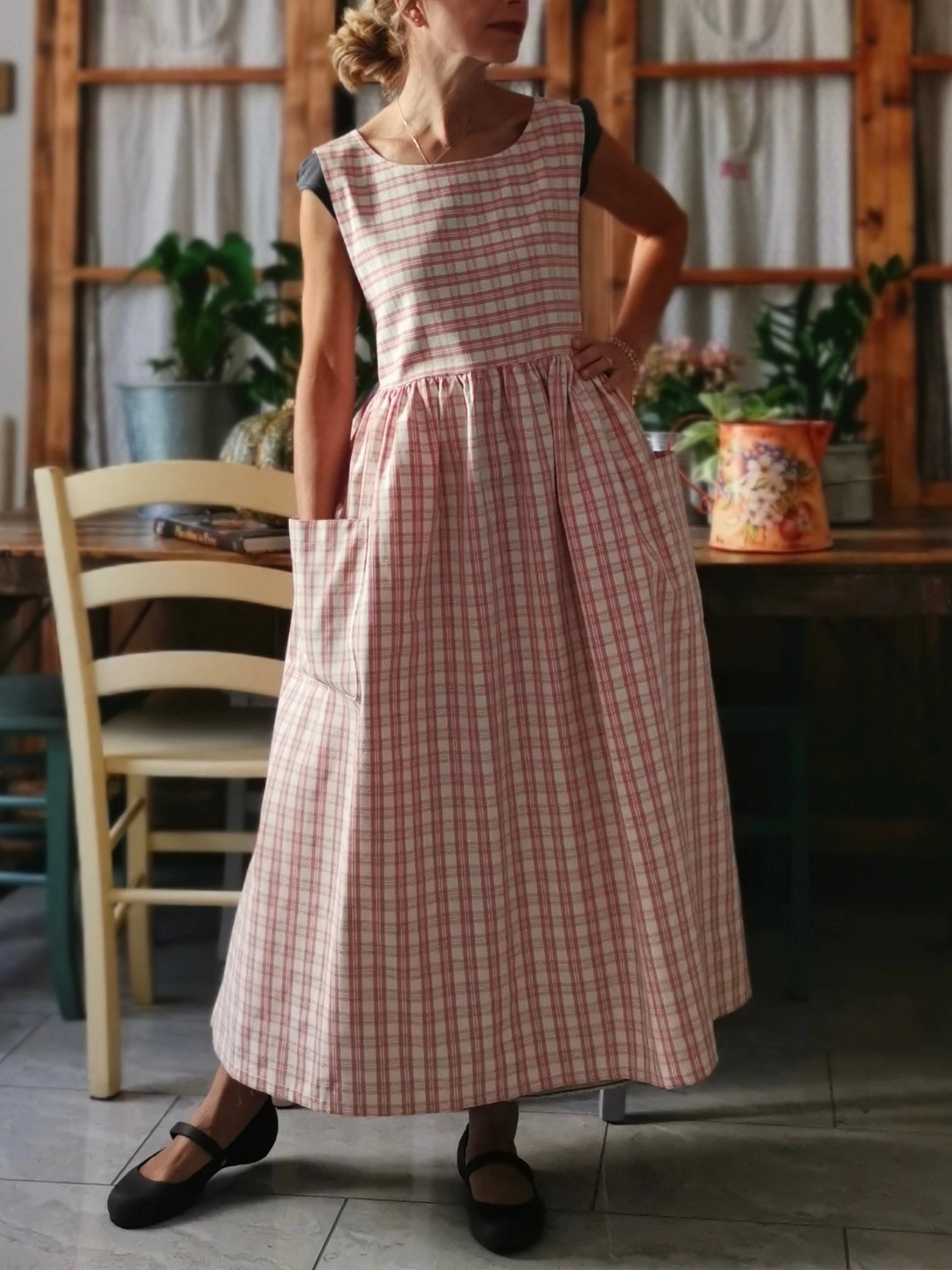 The fabric is a beautiful, durable cotton, in a pretty pink and cream tartan check pattern.