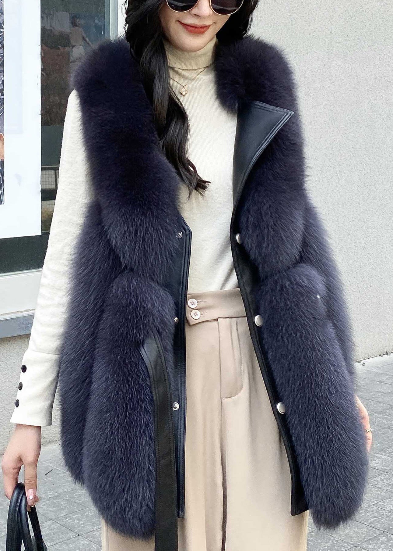 Italian Cocoa Colour Fox Collar Zippered Sashes Leather And Fur Waistcoat Winter