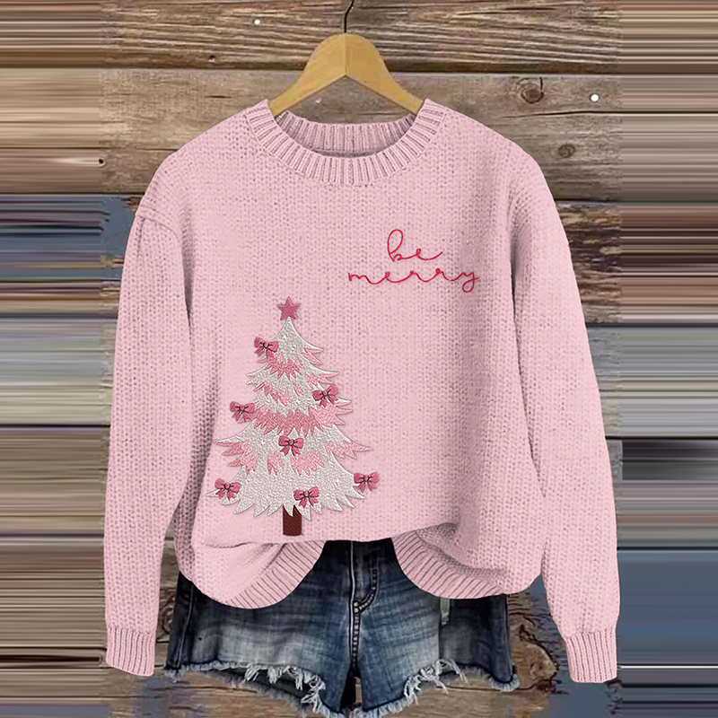 Pink Christmas Tree Embroidery Knitted Crewneck Sweater