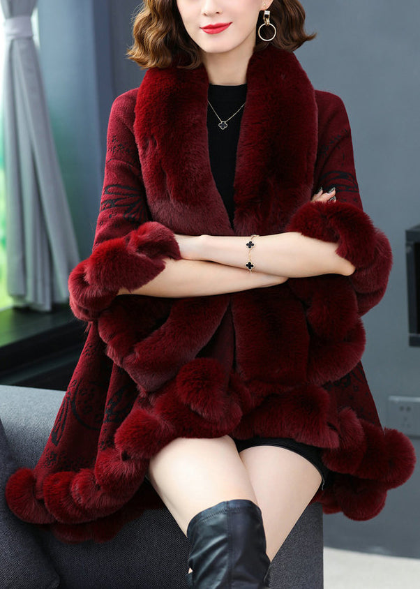 Plus Size Wine Red Fur Collar Print Patchwork Woolen Coat Fall