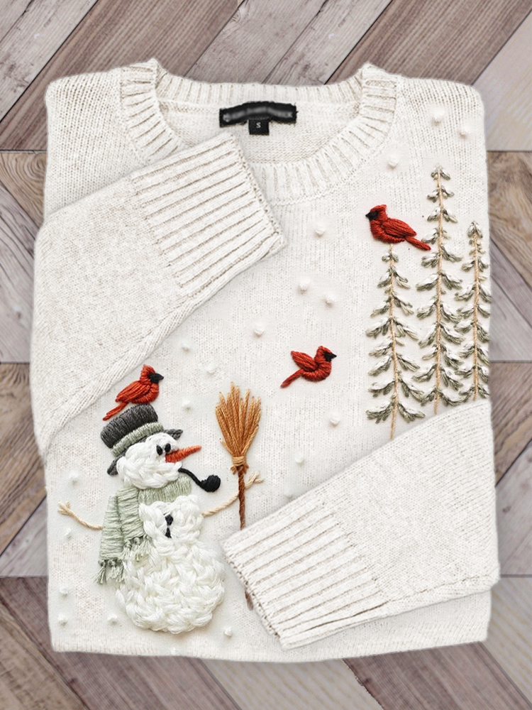 Snowman & Cardinals Snowy Embroidered Cozy Sweater