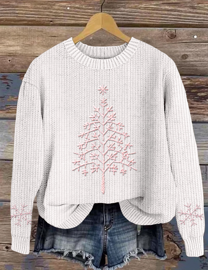 Vintage Pink Awareness Christmas Tree Embroidery Knitted Cozy Sweater
