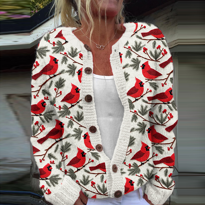 Winter Cardinal Art Embroidery Knitting Cozy Cardigan