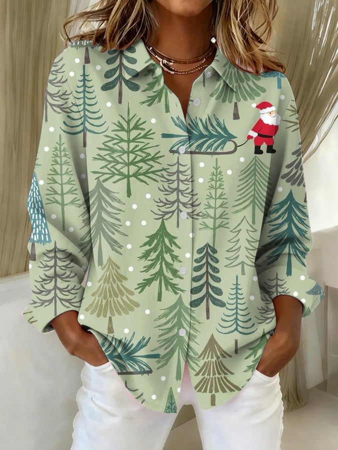 Women's Casual Christmas Print Lapel Long Sleeve Shirt