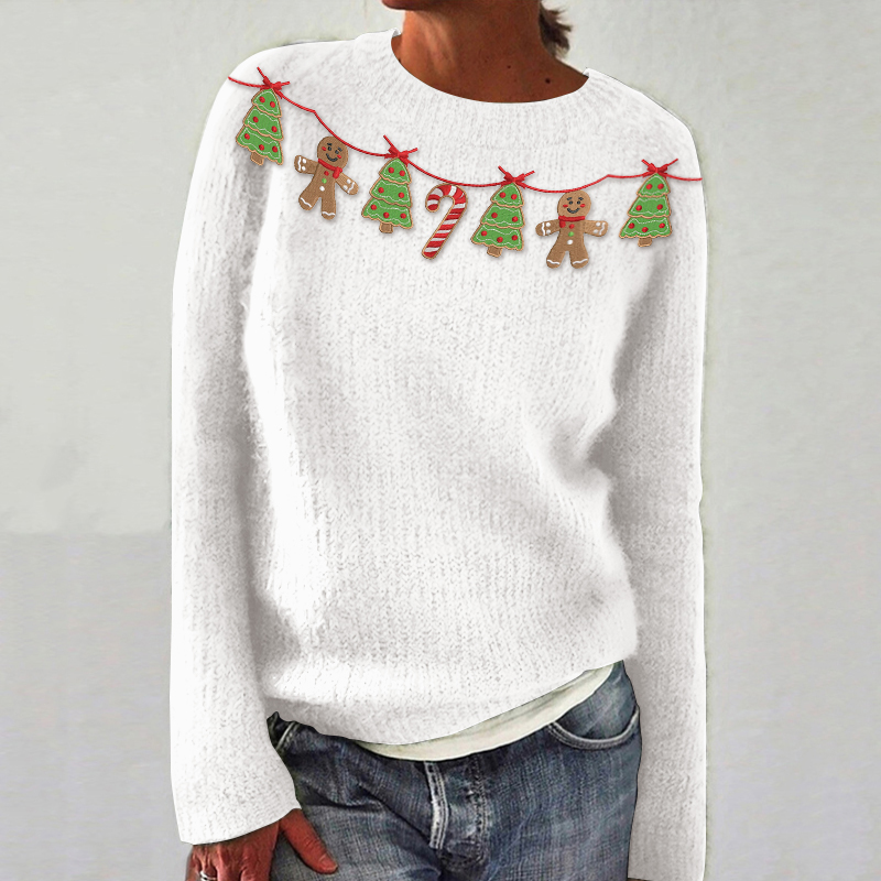 Women's Christmas Tree Gingerbread Embroidery Art Knitted Casual Sweater