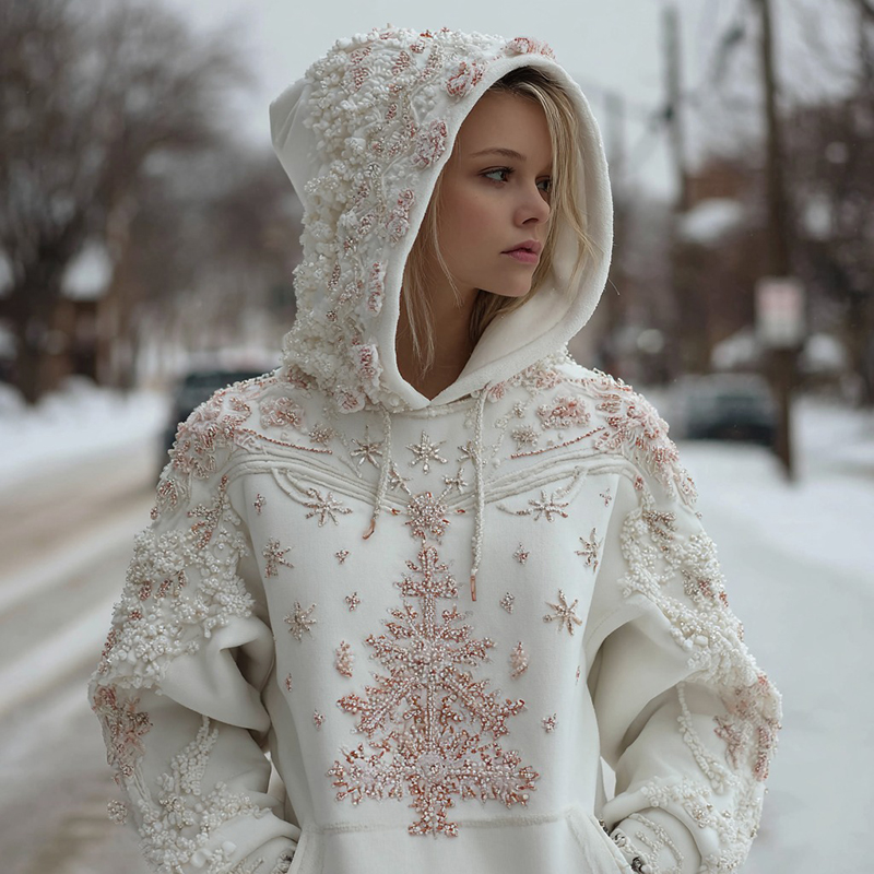 Women's Pink Christmas Tree Embroidery Casual Hooded Sweatshirt