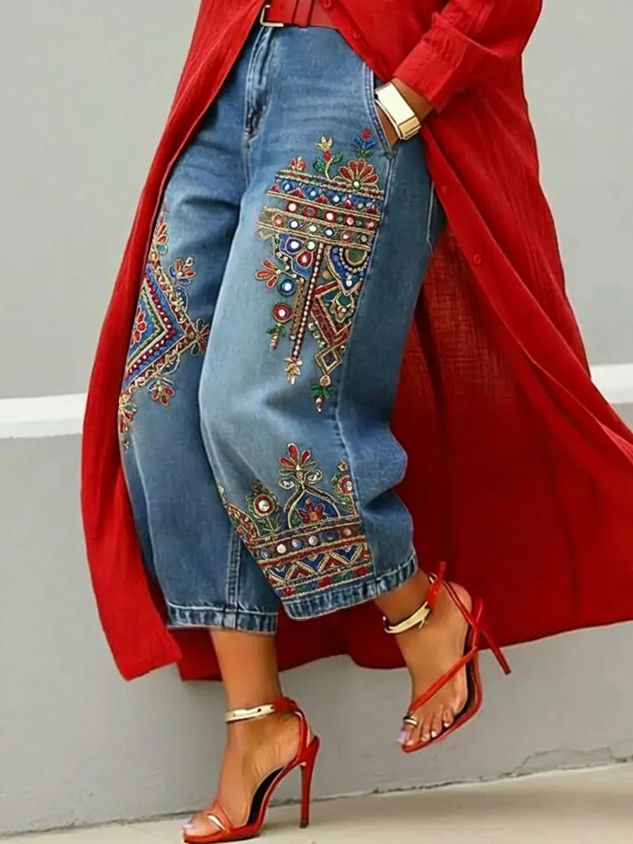 Women's Retro Ethnic Pattern Art Print Casual Jeans
