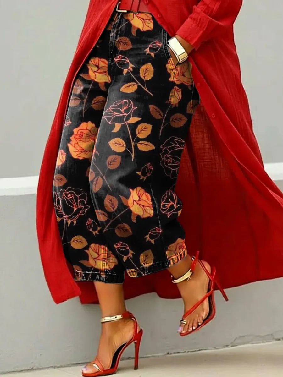 Women's Retro Floral Pattern Art Print Casual Jeans